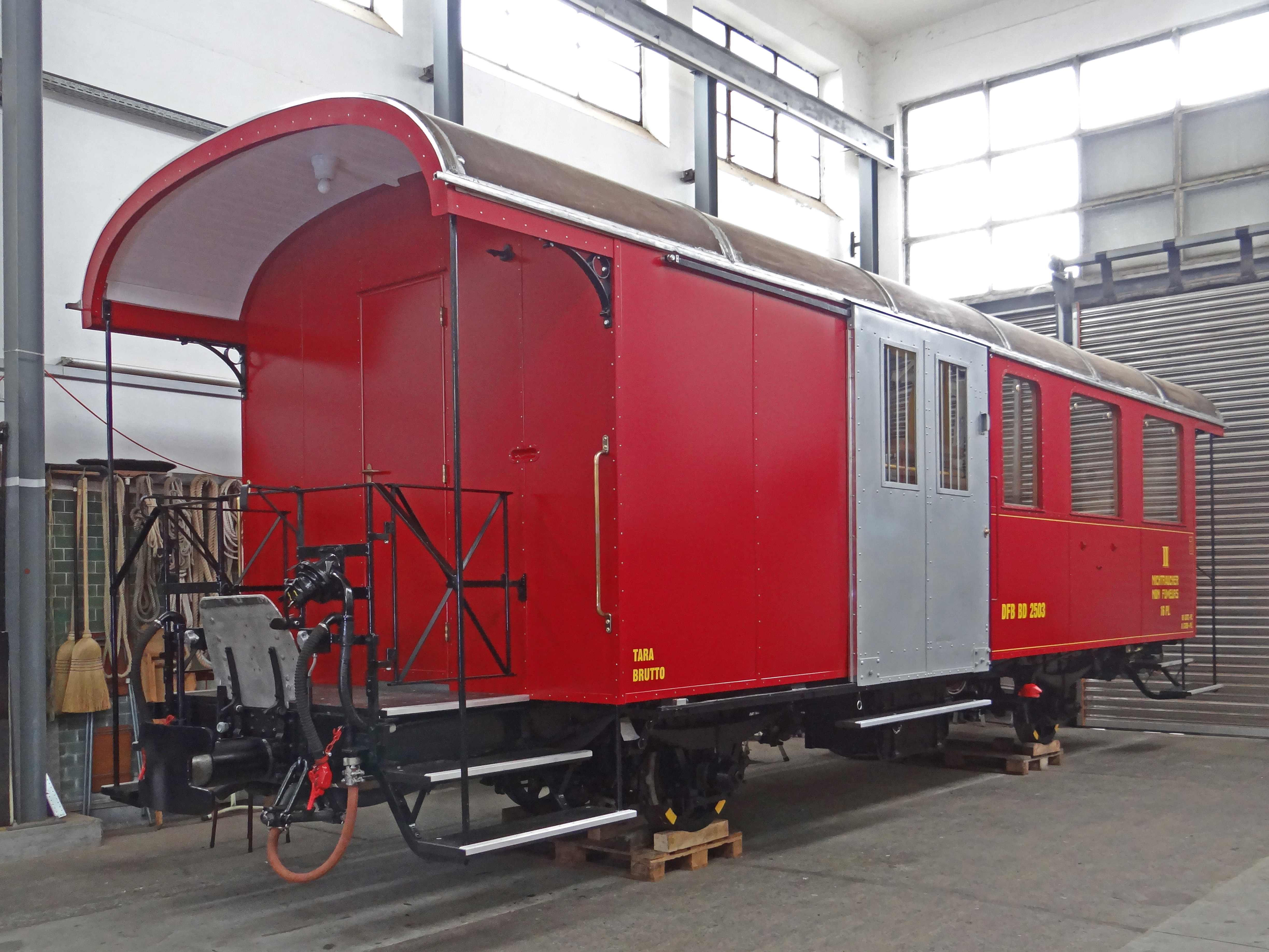 Zweiachsiger Personenwagen mit 2. Klasse und Dienstabteil. Baujahr 1914 Totalrevision und Rückbau in den Zustand von 1929. Fertigstellung und Auslieferung an die DFB 2020.
