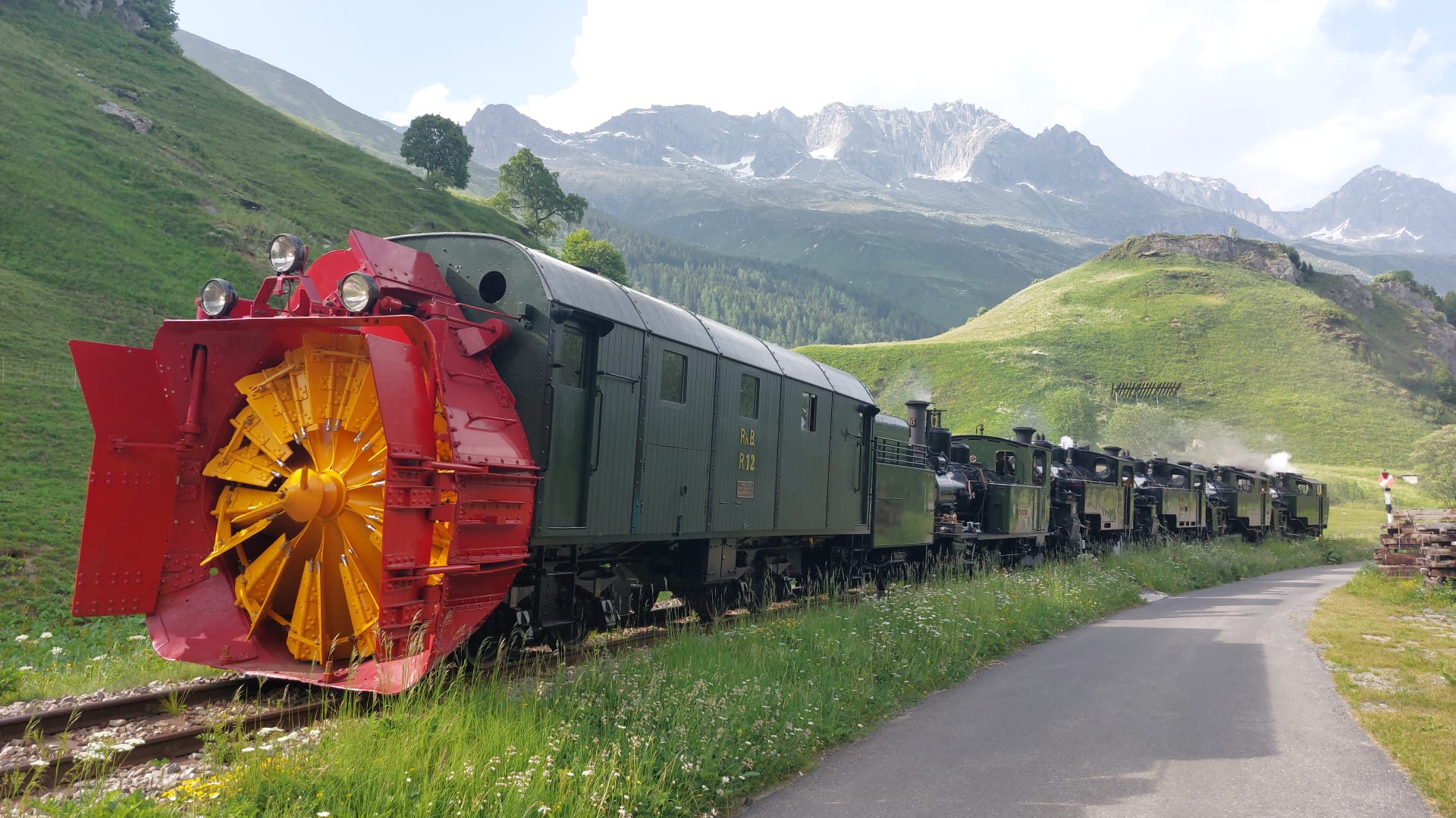 Da am Freitag, 13. Juni 2025 aufgrund der jährlichen Kesselinspektion alle betriebsfähigen Dampflokomotiven und die Dampfschneeschleuder angeheizt waren, liess man es sich zum Abschluss nicht nehmen, ein gemeinsames Stelldichein im Adhäsionsbereich hinter Realp zu präsentieren - was für ein Bild!