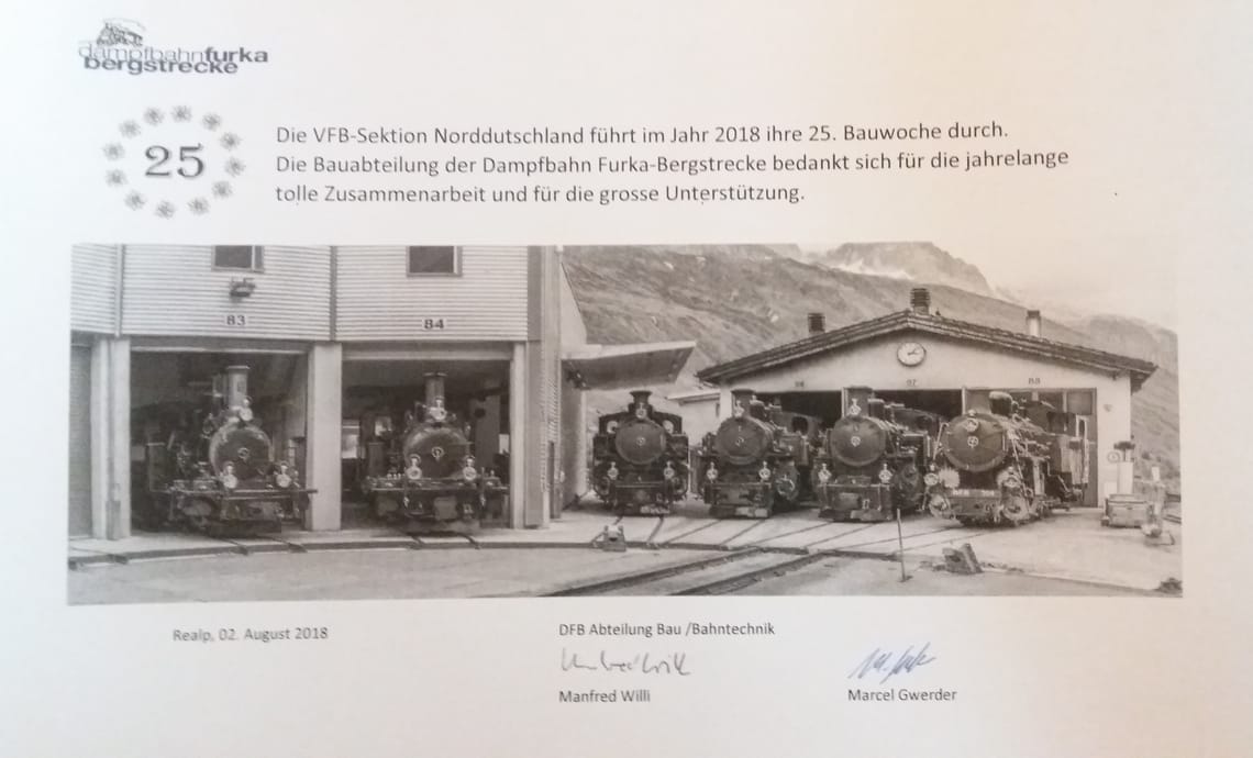 Jubiläumsbauwoche Im Jahr 2018 ist die 25. Bauwoche der Sektion Norddeutschland geleistet worden. Aus diesem Anlass wurde den Mitgliedern, die in Realp waren ein kleines Dokument überreicht: