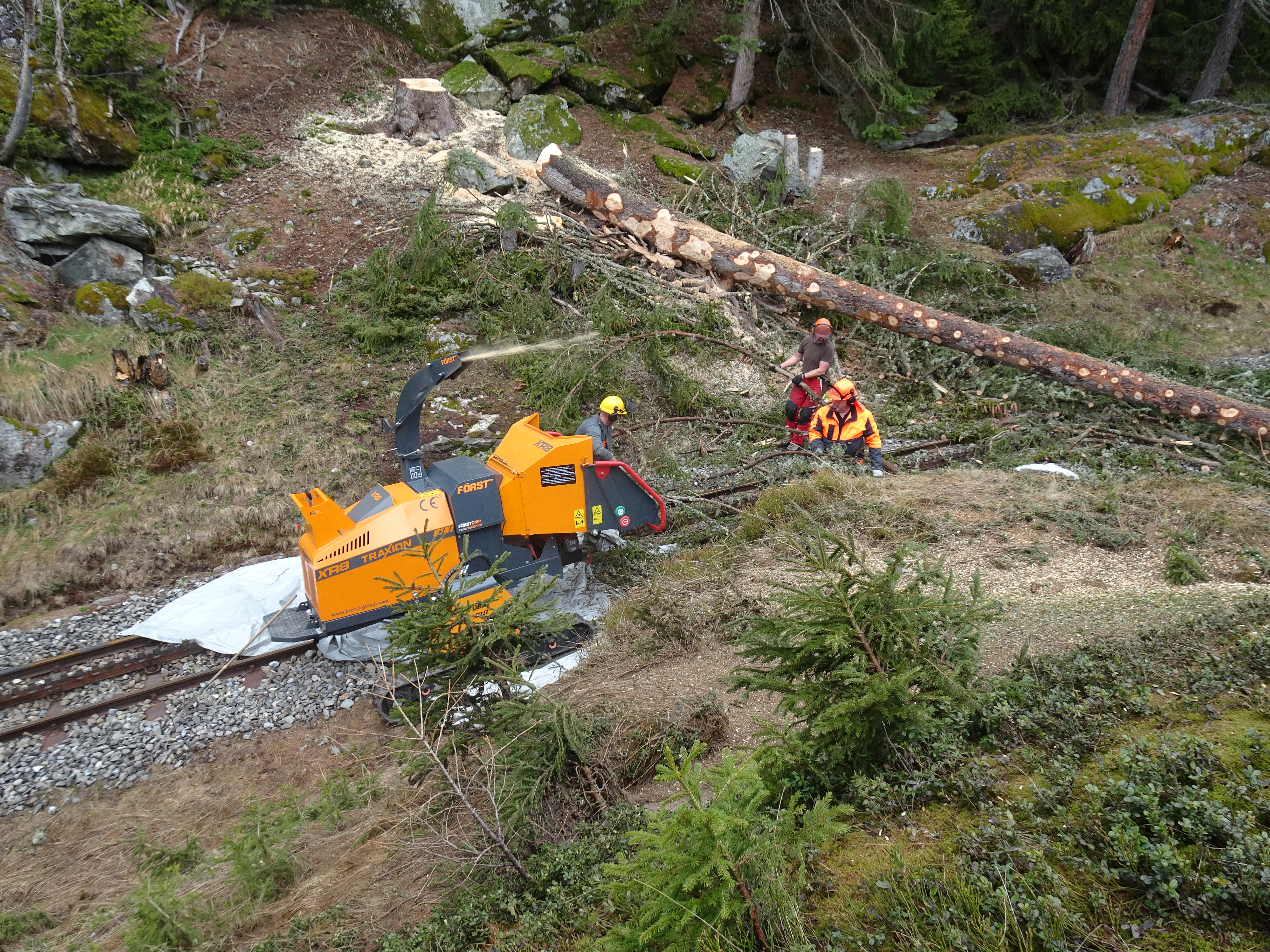 Die «Holzaktion», vom Fällen diverser Bäume von ca. 300 m links und rechts des Gleiskörpers oberhalb des Lammen-Viaduktes, wurde von der Vegetationsgruppe, mit bis zu 3 Fronis aus der Ostschweiz zur Unterstützung, allseits geschätzt. Die Äste wurden an Ort und Stelle mit einem leistungsstarken Häcksler, geschreddert. Die begehrten Baumstämme, aus aktueller Marktlage, werden zu einem späteren Zeitpunkt auf dem Gleis abtransportiert.