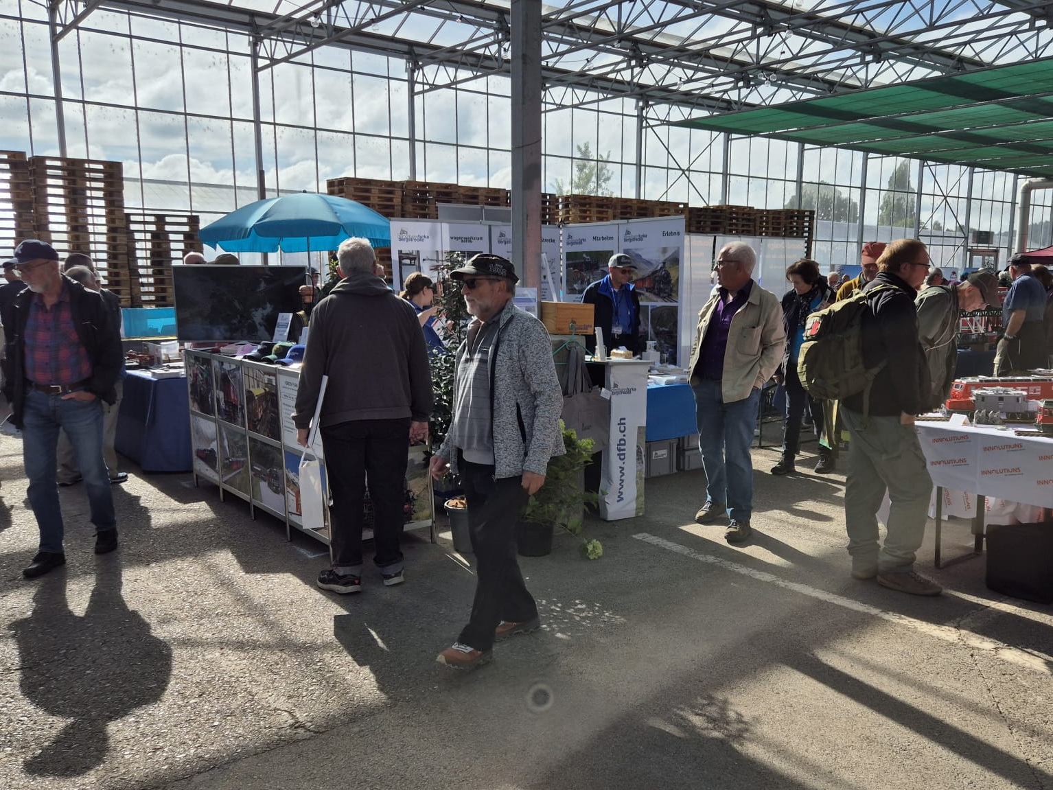 Zum zweiten Mal durfte unser Team die DFB mit einem eigenen Stand am Grossbahnfest auf dem Areal der Firma Zulauf in Schinznach Dorf präsentieren. Bereits am Vortag, d.h. am Freitagnachmittag, mussten wir unseren Bauten im leergeräumten Pflanzentreibhaus aufstellen. Als besondere Herausforderung galt es, die Bauteile unseres Standes an eine tragende Hallenstütze anzupassen. Bei warmen Herbstwetter waren beide Ausstellungstage sehr gut besucht, und unser Team voll damit beschäftigt, die vielen Fragen und Wünsche der Standbesucher zu befriedigen. In regelmässigen Abständen ratterte die vollbesetzte Garten-Dampfbahn von Zulauf durch die Halle und sorgte für die richtige Stimmung. Mit dem Souvenirverkauf konnten wir einen schönen Zustupf für unsere Vereinskasse erwirtschaften. Fazit: ein rundum gelungener Anlass!