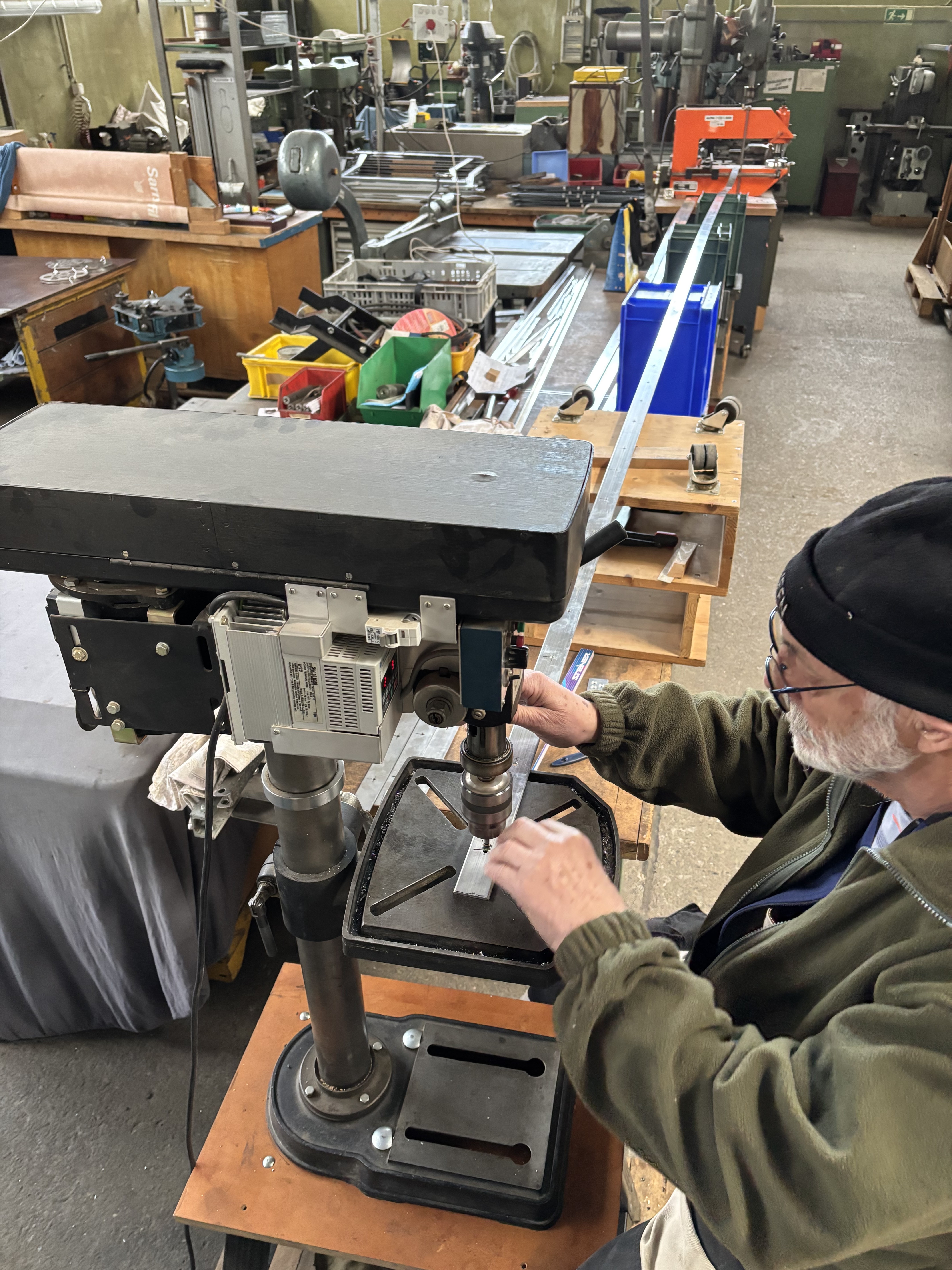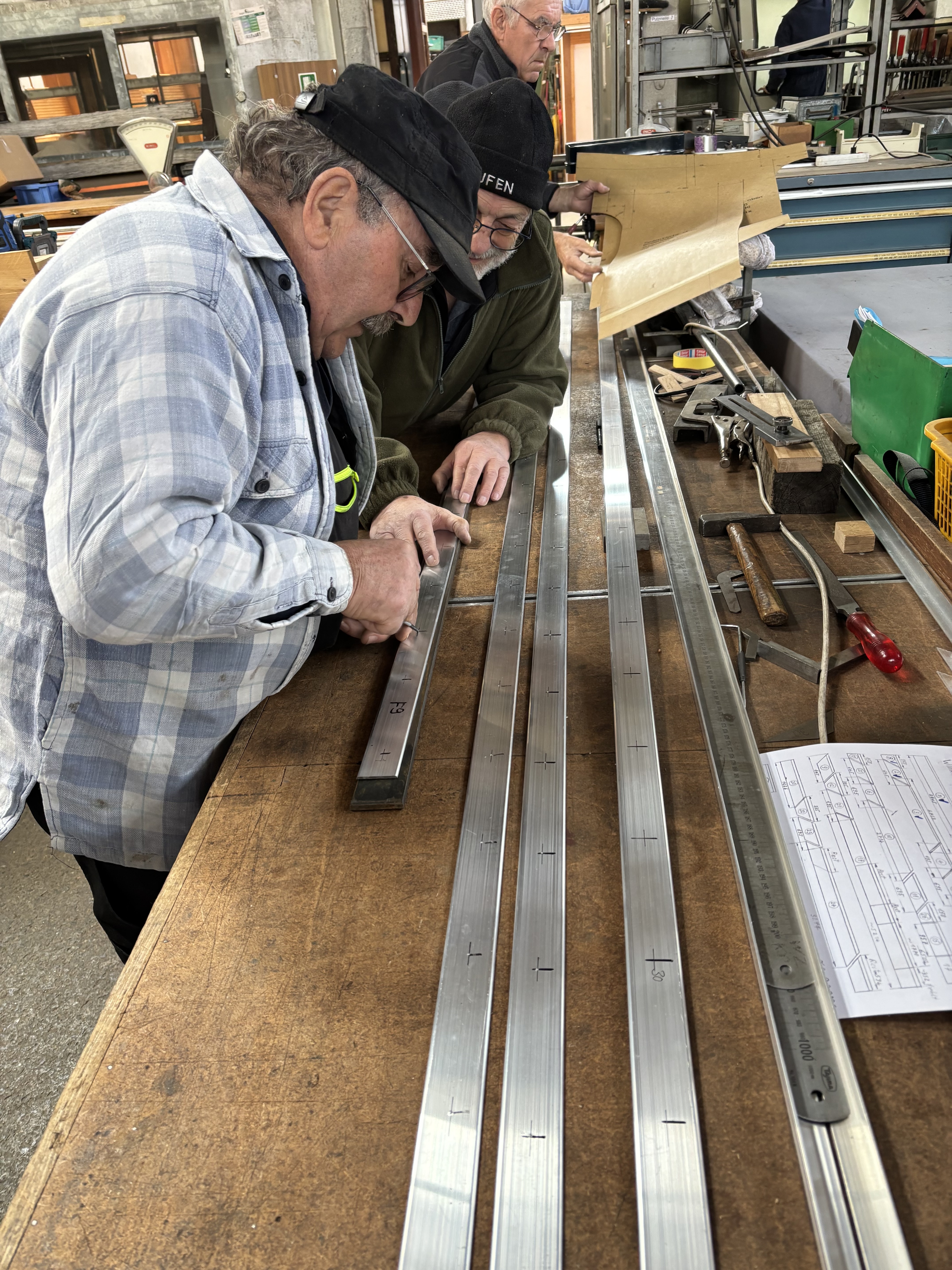 Für die Außenverschalung wurden erste Alu-Profile gebohrt und Alublechtafeln zum Schneiden vorbereitet.