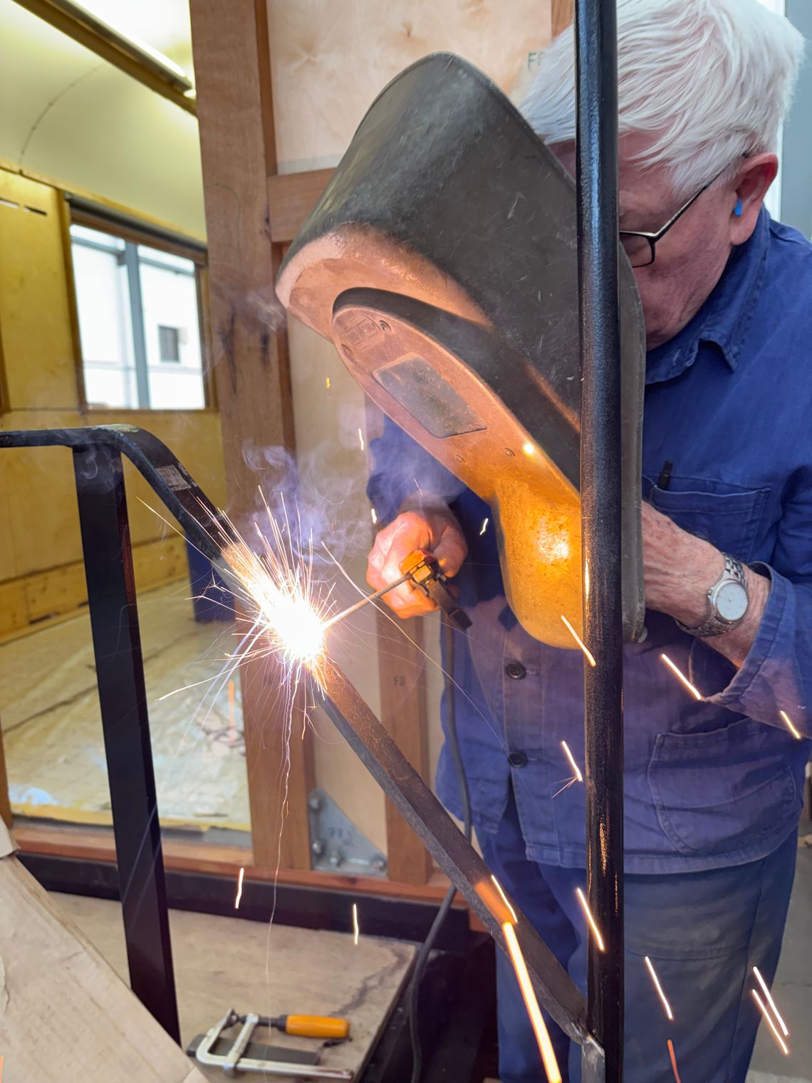Das Geländer auf der Plattform wurde den neuen Gegebenheiten angepasst und verschweißt. Die Eingangstüren sind so weit fertiggestellt, dass sie zum ersten Mal lackiert werden können.