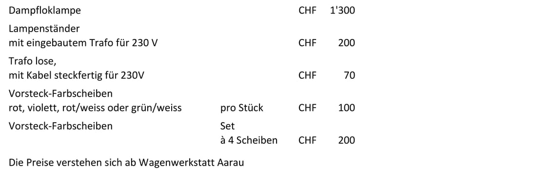 Der Ursprung des Lampenbaus geht auf das Jahr 1988 zurück, als für die Lok "Weisshorn" dringend Lampen benötigt wurden und auf dem Markt keine zu erschwinglichen Preisen beschafft werden konnten. Auch für die aus Vietnam zurückgeführten Loks fehlten die Lampen. Mitarbeiter der Wagenwerkstatt Aarau konstruierten das heutige Modell, das mit den in unserer Schlosserei verfügbaren Mitteln hergestellt werden kann.