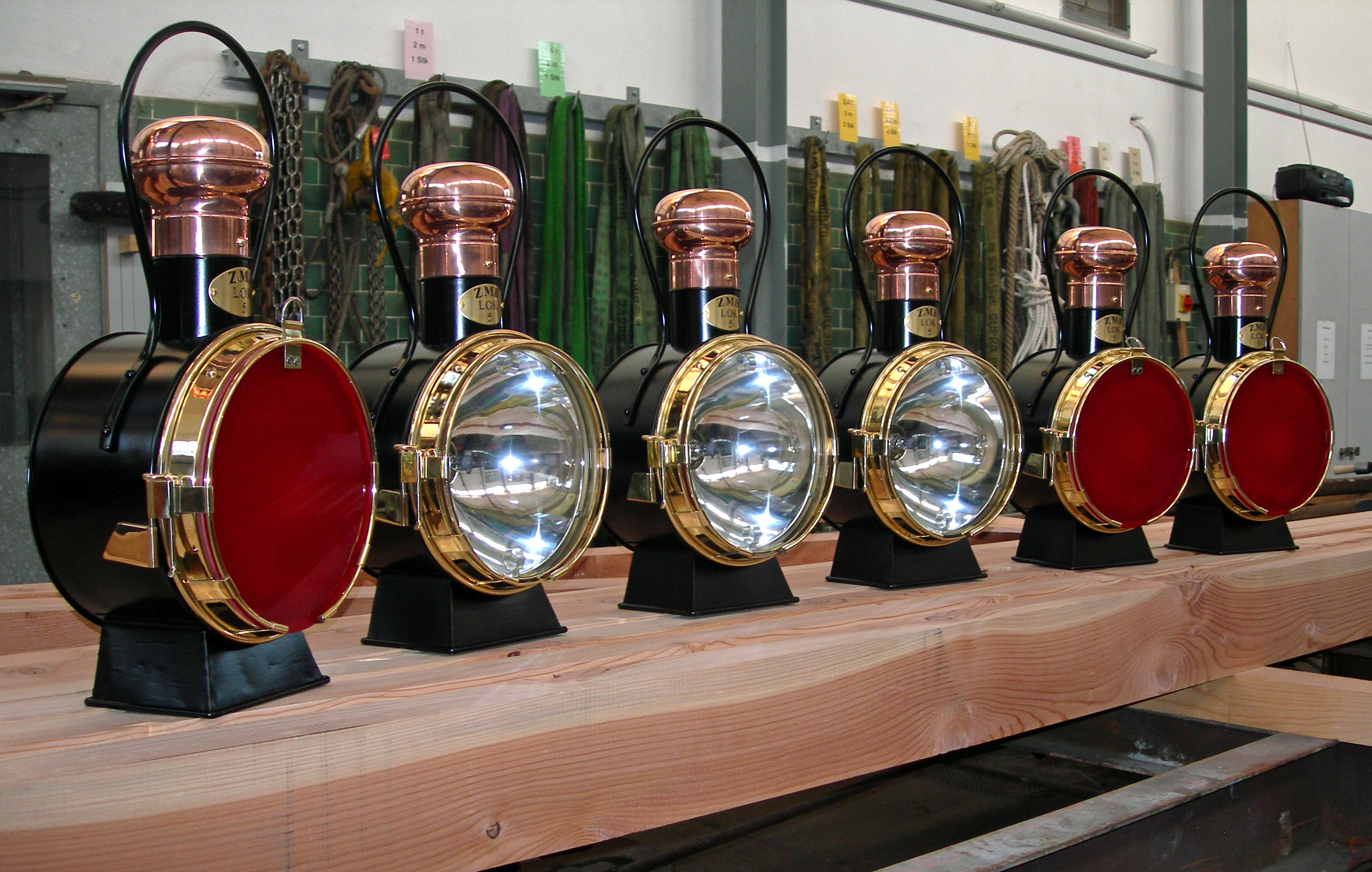 Immer ein wenig im Hintergrund, aber fortwährend, läuft in der Wagenwerkstatt die Produktion von Dampfloklampen, wie sie auch unsere Loks zieren. Die Mitglieder des Lampenteams haben sich auf die spezifischen Techniken der Lampenfertigung spezialisiert. Hohe Präzision und z.B. das Schweissen der dünnen Bleche erfordern besondere Aufmerksamkeit. Die Frontringe aus Messing und die Hunzen aus Kupfer sind Metalldrückteile aus eigener Herstellung. Sie bestechen durch tadellosen Glanz. Über 200 Lampen konnten wir bislang an verschiedene begeisterte Einzelkunden ausliefern.