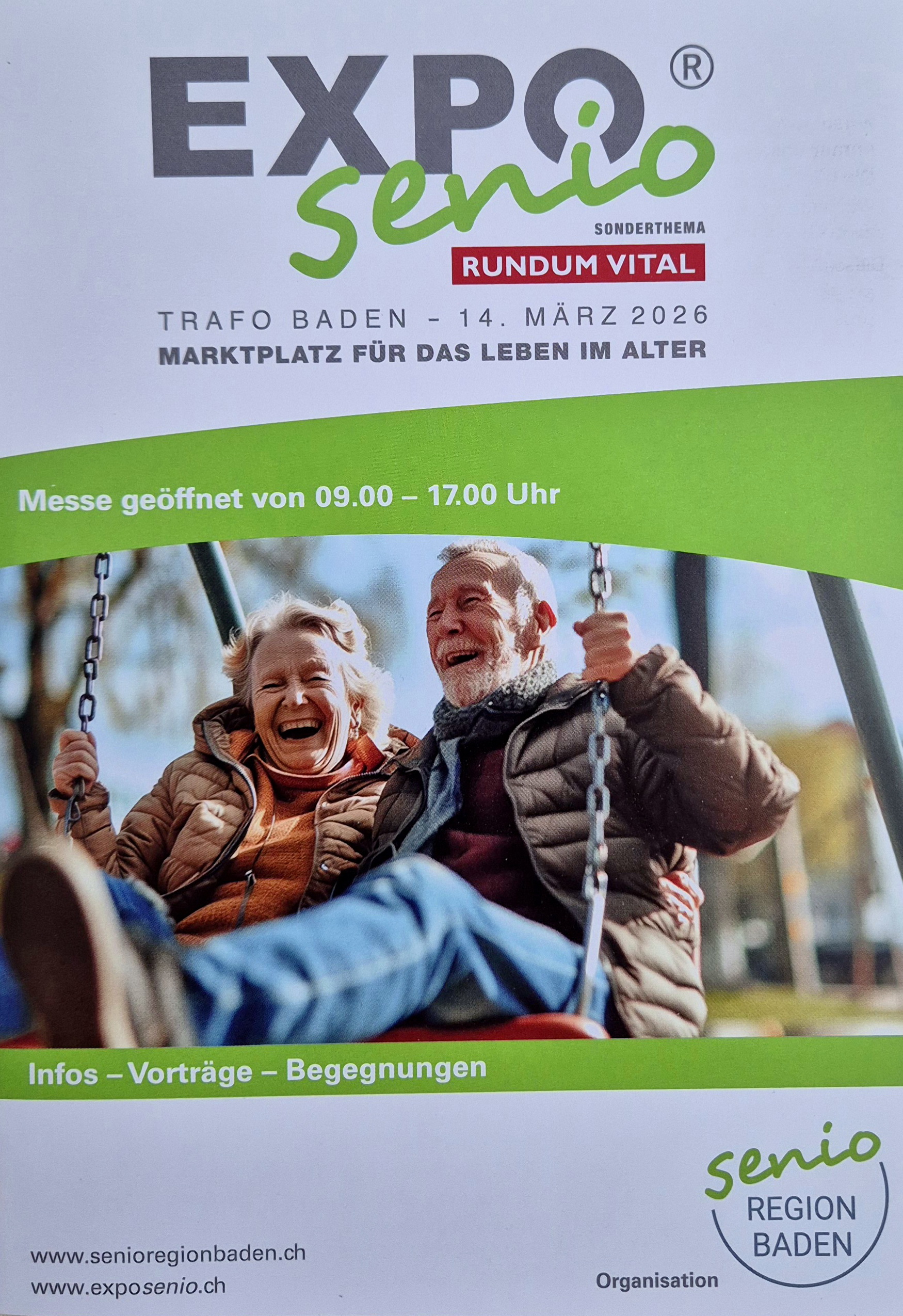 Am 14. März 2026 sind wir an der ExpoSenio in den Trafohallen in Baden wieder mit einem schönen Werbestand vertreten. (Details s. Flyer und unter www.exposenio.ch)