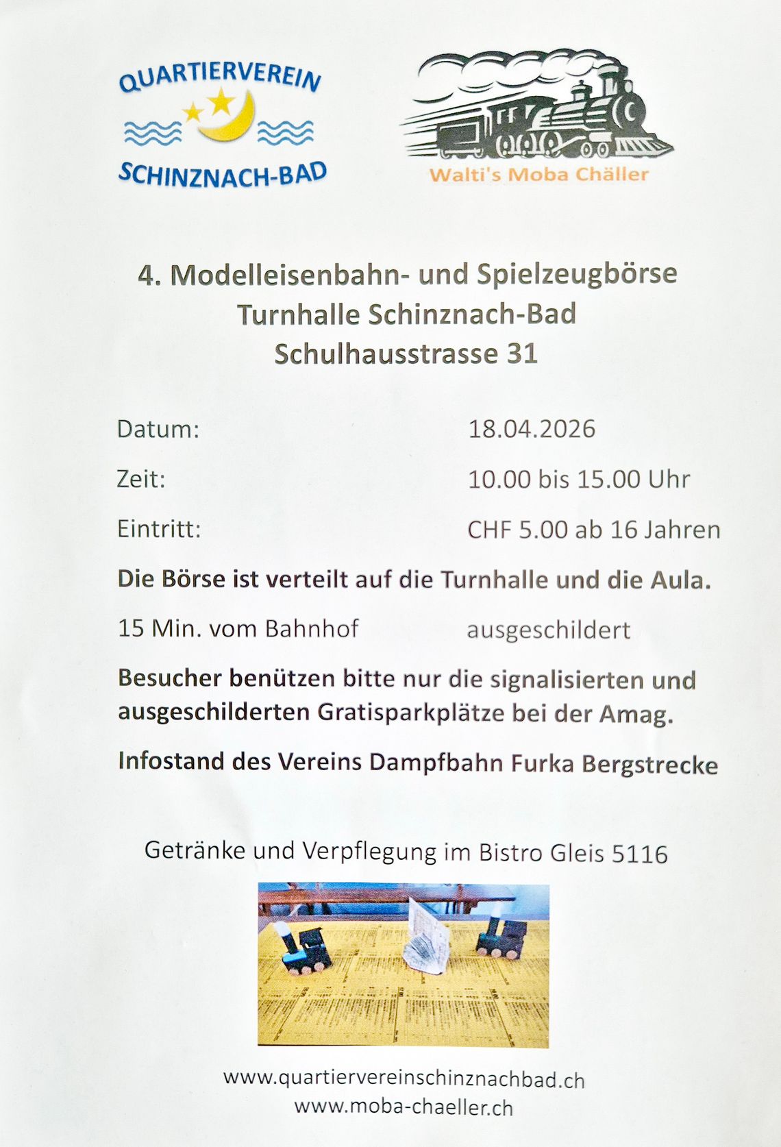 Zum ersten Mal nehmen wir an der Modeleisenbahn-Börse in Schinznach Bad teil. Datum: 18. April 2026 (Details siehe Flyer)