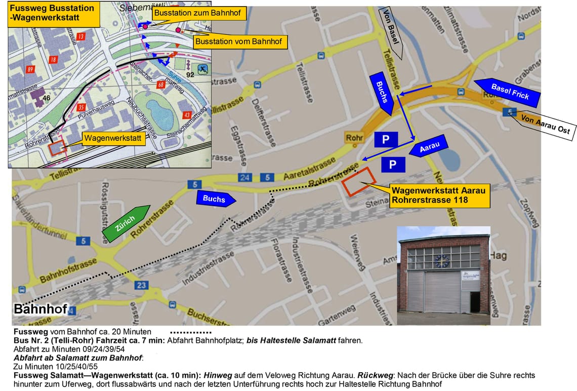 Vom Bahnhof aus erreicht man die Werkstatt am besten zu Fuss in ca. 20 Minuten. Es gibt leider keine sehr günstige Verbindung mit dem öffentlichen Verkehr. Man kann aber vom Bahnhof aus mit dem Bus Nr. 2 (Telli-Rohr), Haltestelle am Bahnhofplatz, bis zur Haltestelle Salamatt fahren und von dort zu Fuss auf dem Veloweg Richtung Aarau zur Wagenwerkstatt gelangen. Details siehe Lageplan.